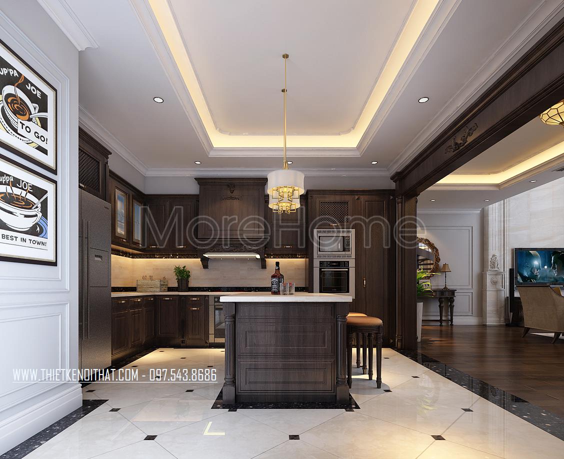 Với màu nâu đặc trưng, không chỉ có tủ bếp mà cánh cửa ở gần đó, bộ bàn ghế ăn, cửa sổ cũng được làm bằng gỗ óc chó tạo nên sự đồng nhất gam màu, mang lại sự sang trọng, lịch lãm và vô cùng đẳng cấp. Hệ tủ bếp được chia thành nhiều bộ phân như tủ bếp dưới, tủ bếp trên, tủ bếp đứng lớn hay tủ bếp với cánh bằng gỗ và cánh bằng kính. Trên từng cánh tủ, từng đường viền đều được thiết kế mềm mại, nhẵn bóng. Cũng chính màu nâu mang đến sự gần gũi, thân thiện, tình cảm gắn bó gia đình qua từng bữa cơm.