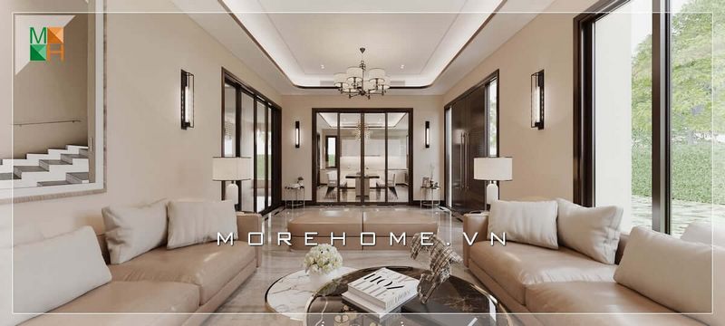 Nội thất phòng khách biệt thự tân cổ điển được trang trí nhẹ nhàng, không quá cầu kì vào từng chi tiết nhỏ, giúp tạo nên không gian sang trọng, thoáng đãng hơn.