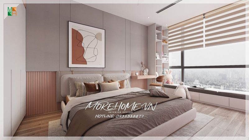 Các kệ, tủ được đơn giản hóa bằng các thanh gỗ nhỏ giúp tiết kiệm không gian và tạo độ thoáng cho căn phòng. Sự kết hợp giữa tủ đồ và ghế ngồi, không gian thư giản gần cửa sổ một ý tưởng sáng tạo mang lại sự tinh tế cho thiết kế.